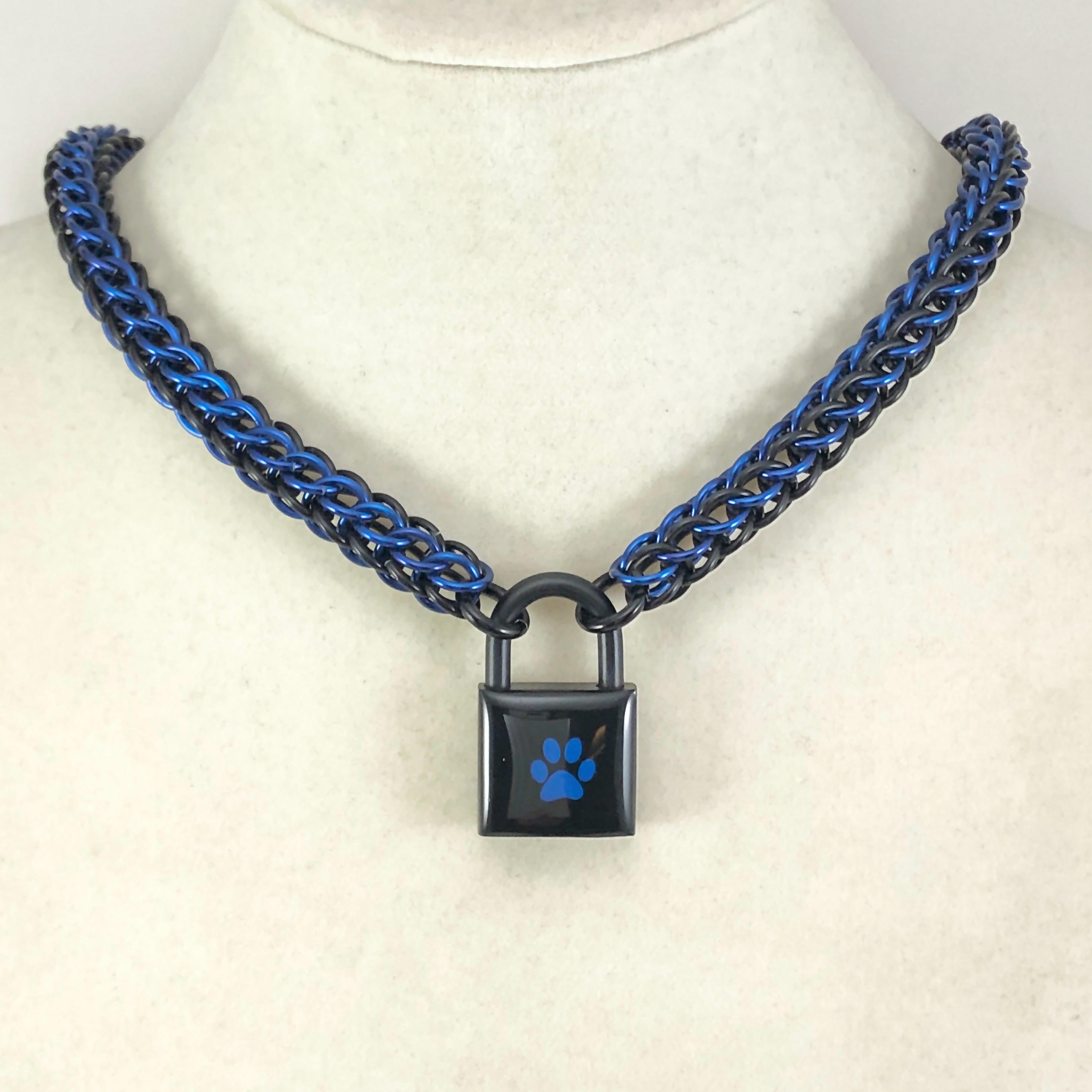 The collar closes with a black powdered brass padlock with your choice of either a blue paw print on a black background, or a black paw print on a blue background. A polishing cloth is included with each order to help care for your lock - polishing it often will help keep your lock looking shiny and new for as long as possible.