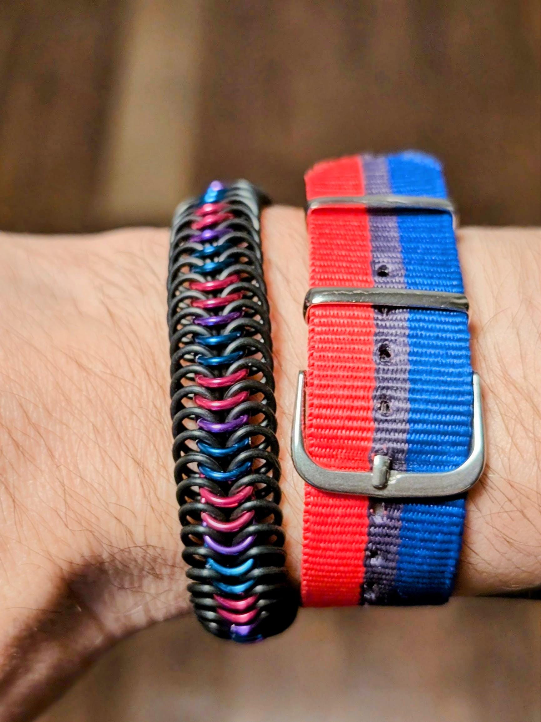 Celebrate Pride in style with an eye-catching and comfortable stretchy bracelet! Each one is made by hand with a combination of black EPDM rubber and anodized aluminum rings (so it’s hypoallergenic, yay!) in a chainmaille pattern known as the European 6-in 1 weave. Around the center of the bracelet, vibrant anodized aluminum rings are arranged in the colors of the Pride flag of your choice. Choose from Gay (rainbow), Trans, Bi, Pan, Nonbinary or Ace. If you’re looking for a flag that’s not listed let me know and I’ll be happy to make it for you if I can!