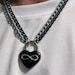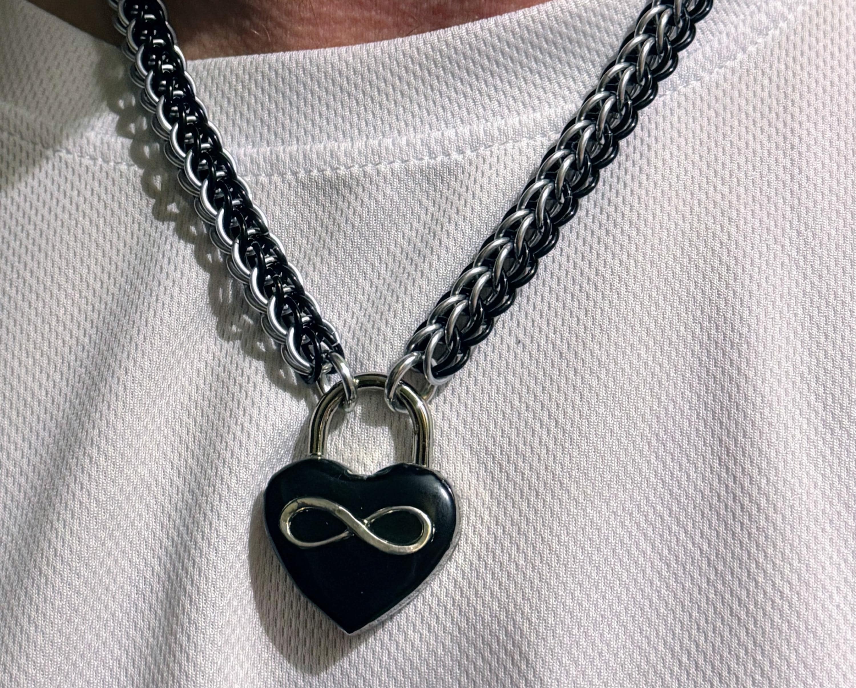 This bold, chunky chainmail choker is made by hand using the finest quality polished silver and black anodized aluminum rings in a Full Persian, or Fox Tail weave, with a large polished nickel silver heart shaped padlock closure at the front. The lock is reversible, you can have the keyhole showing at the front, or flip it over to reveal the back which has been adorned with a silver infinity loop on a jet black background, a beautiful symbol of one's devotion. The lock measures about 1 1/4", and comes with two keys.