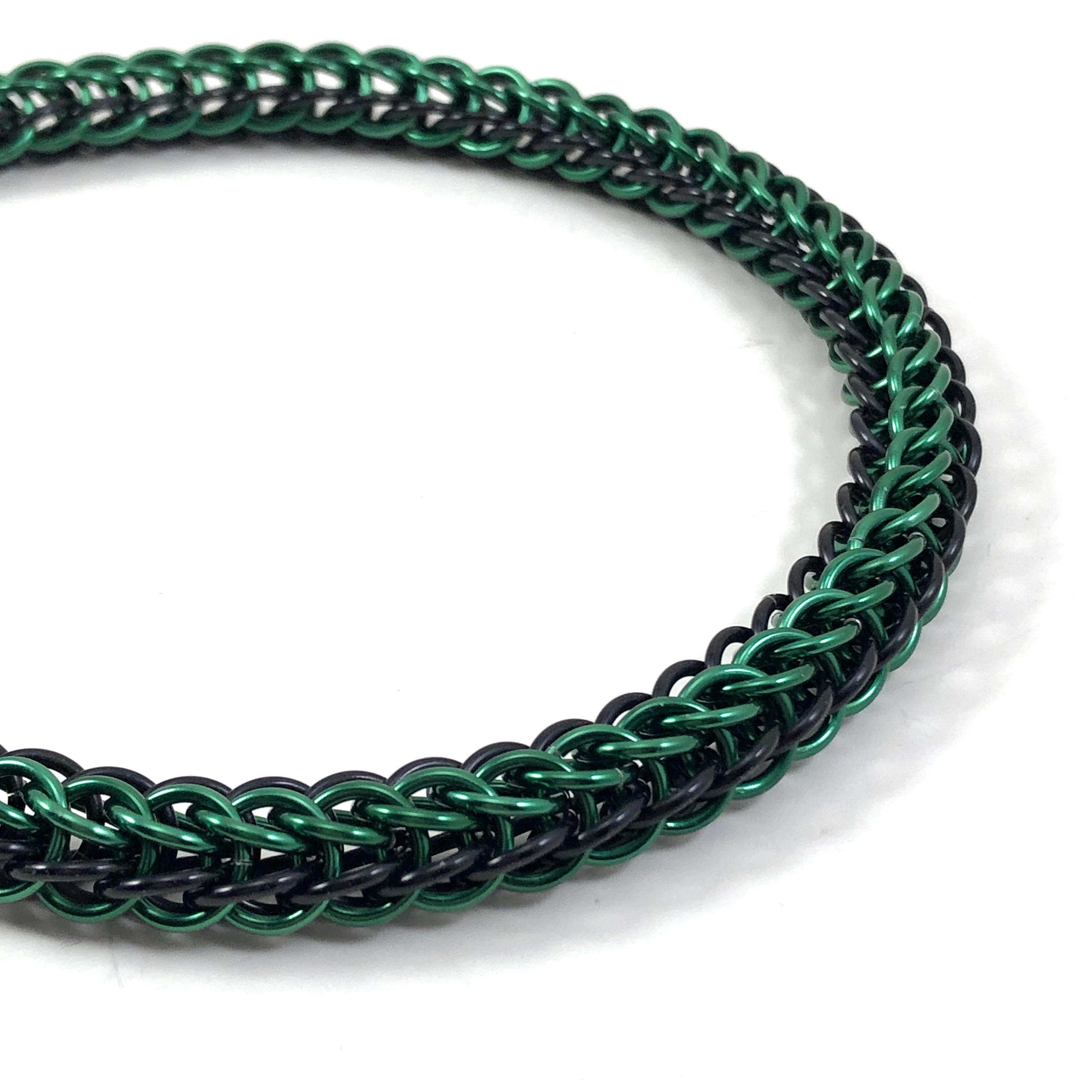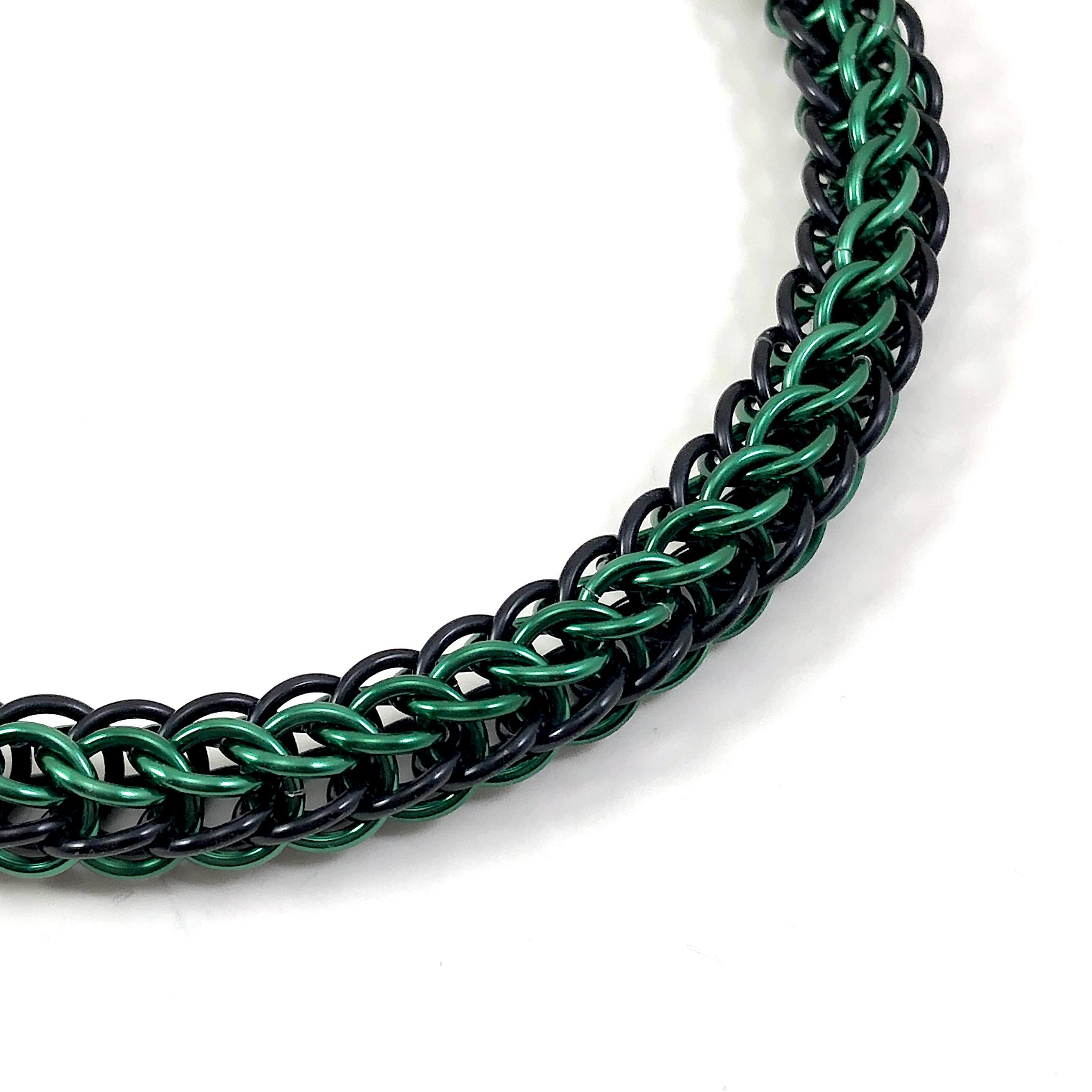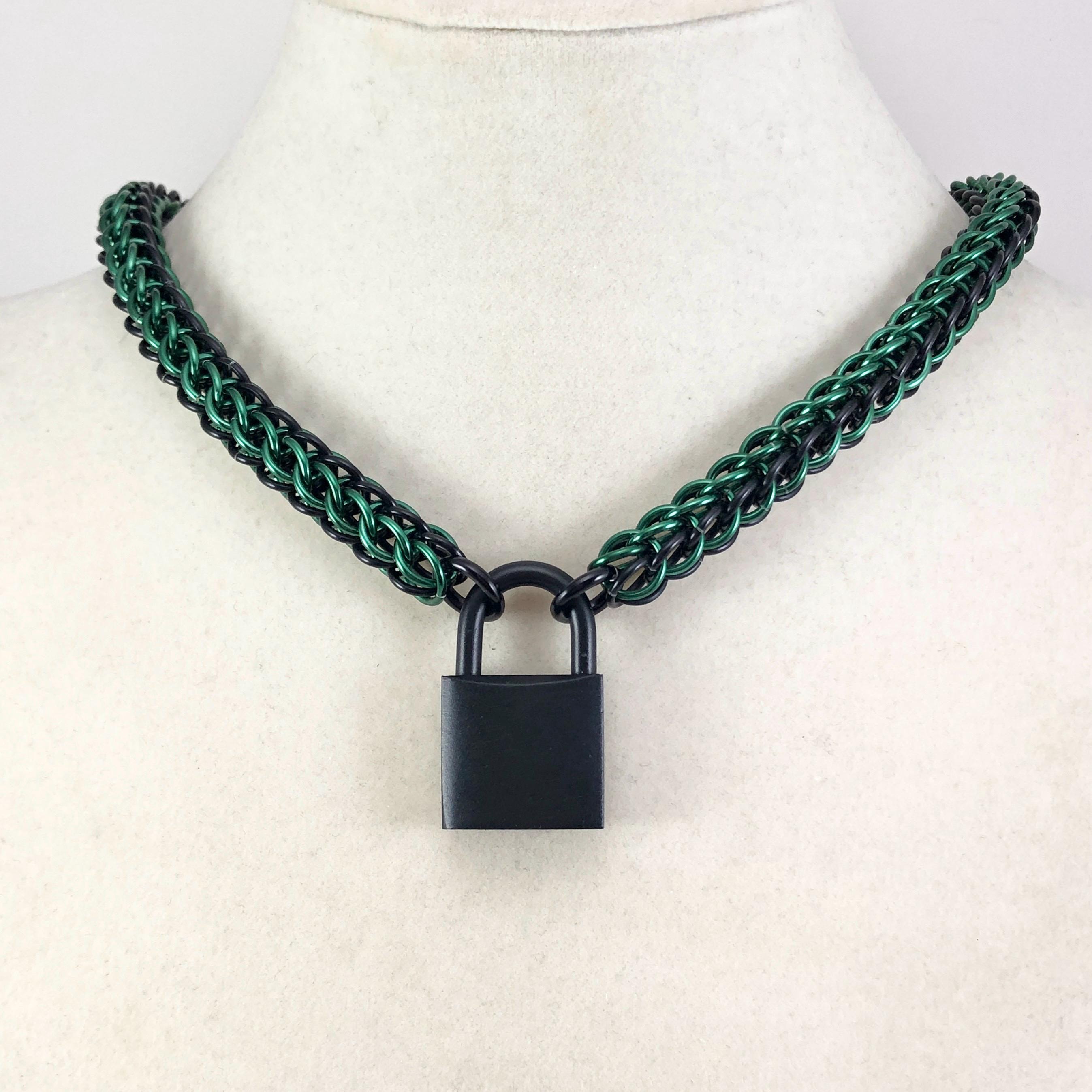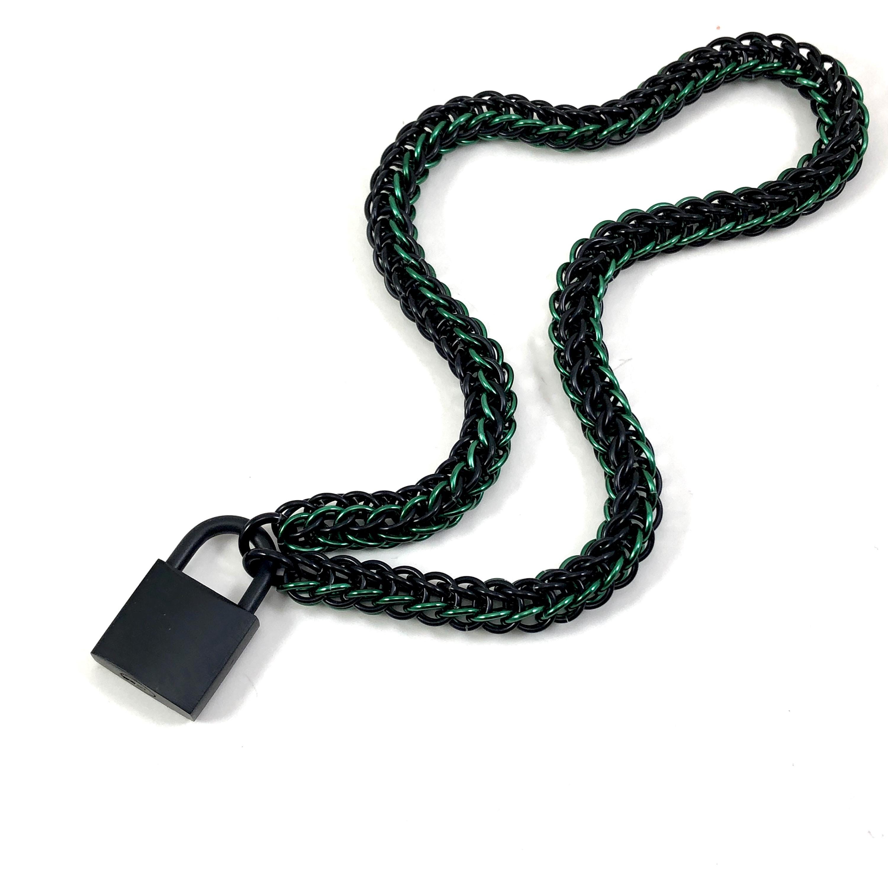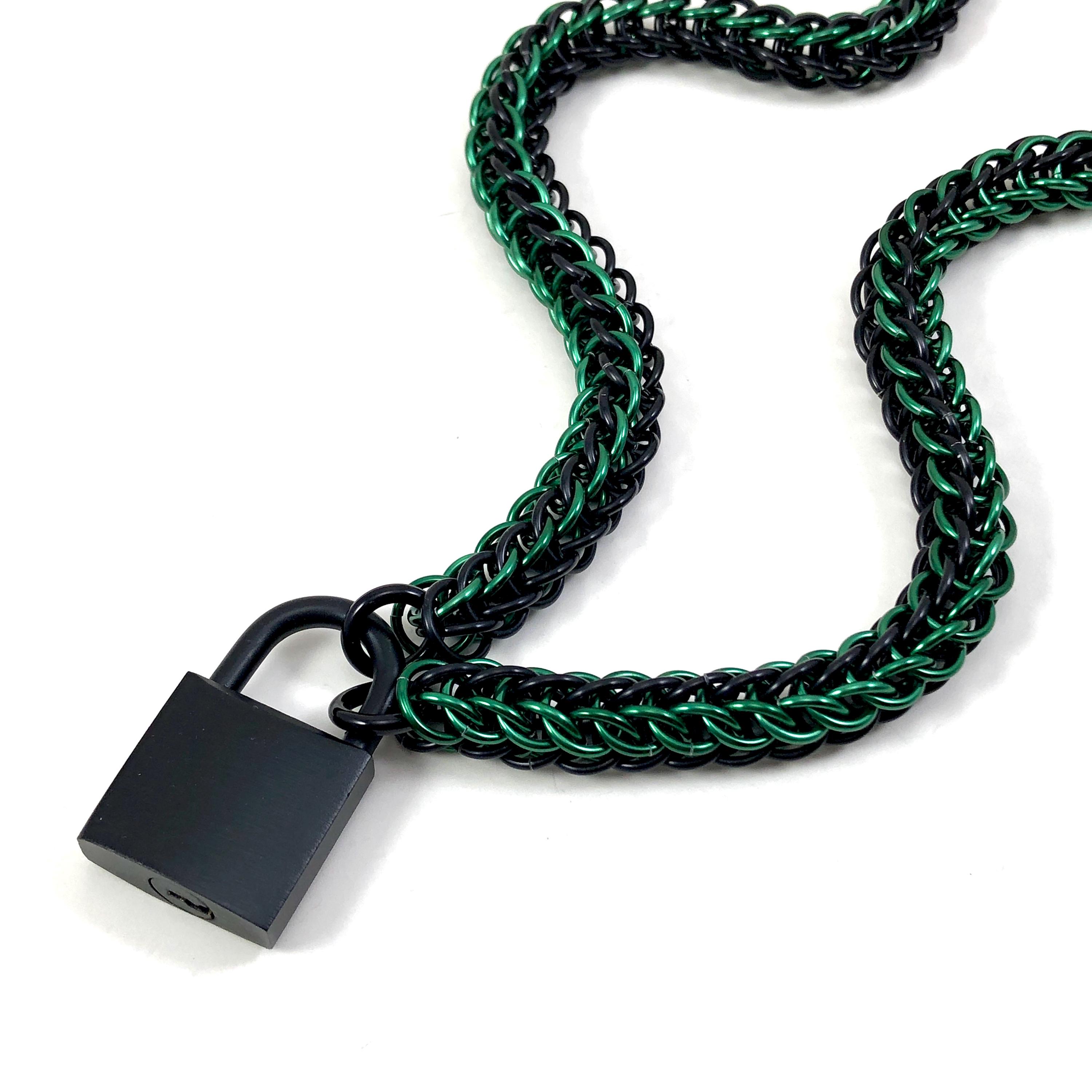 This bold, masculine submissive collar is hand crafted with shining emerald green and black anodized aluminum rings in a Persian, or fox tail chainmaille pattern. It closes in front with a matte black powdered brass square padlock which comes with two keys.