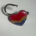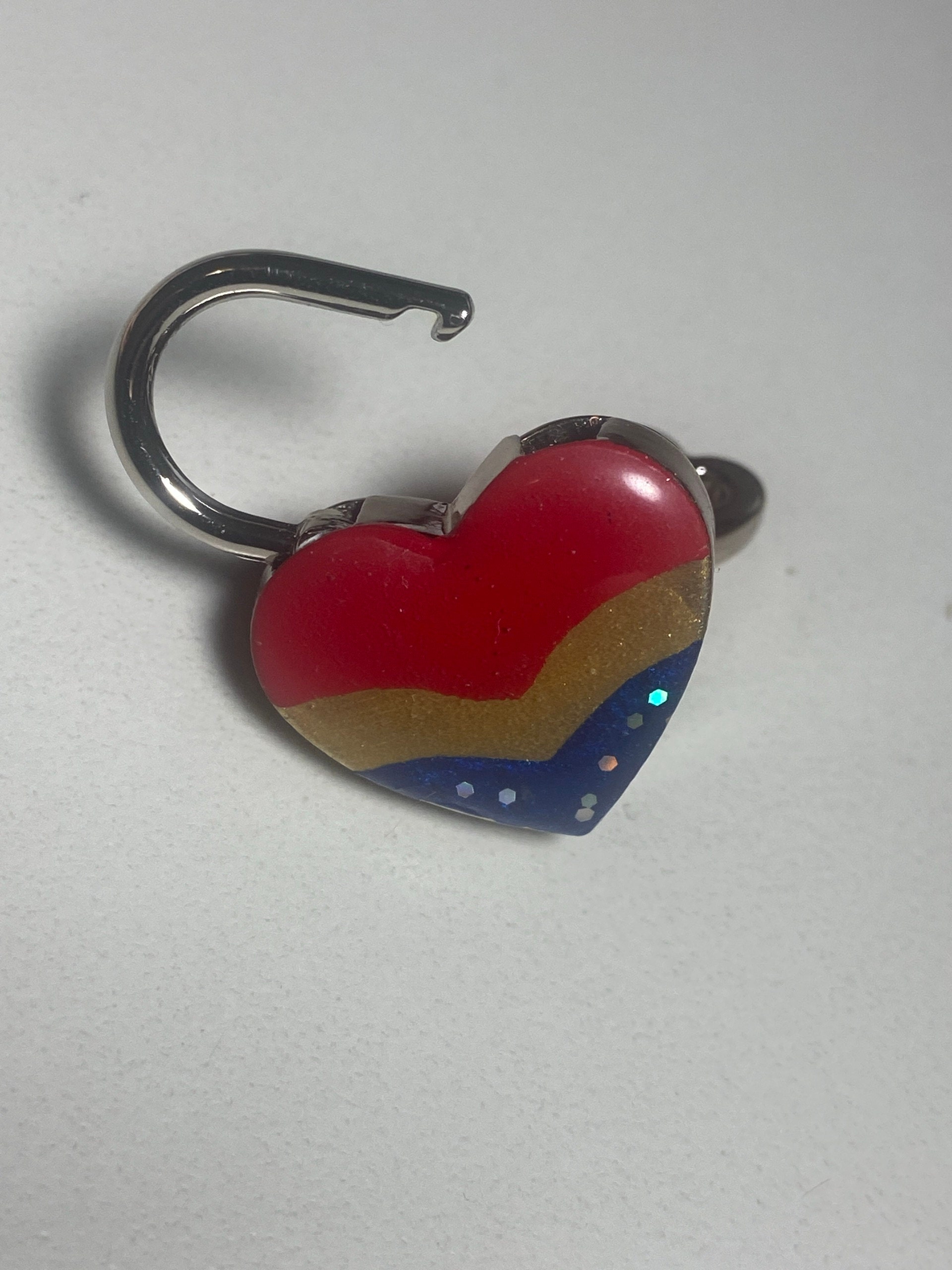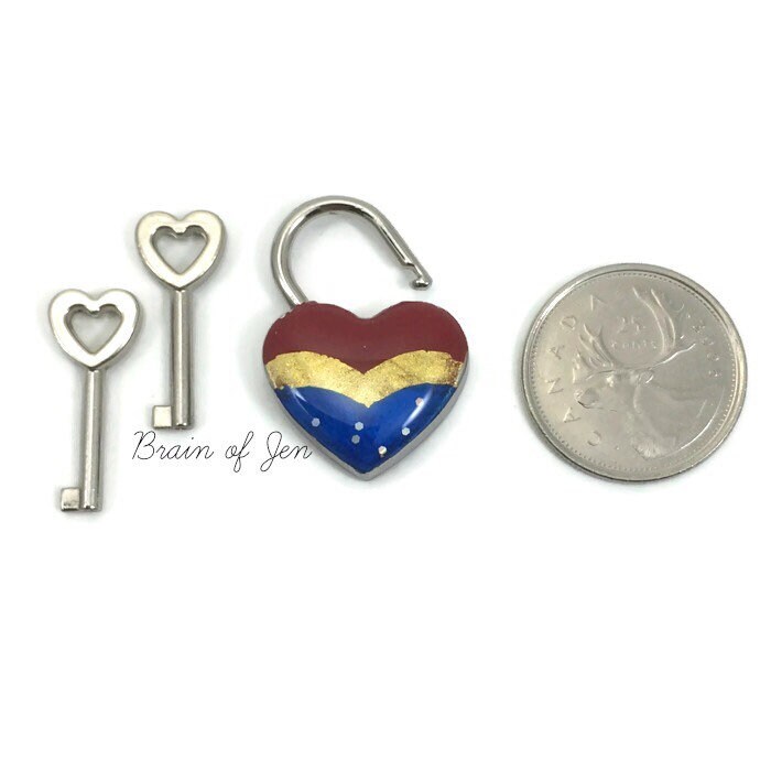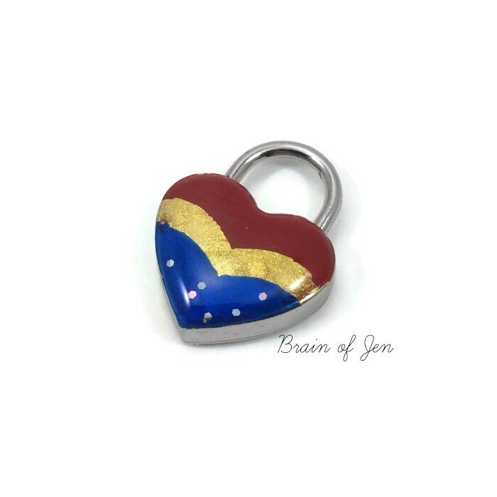 20 mm nickel silver heart lock adorned on one side with a red, gold and blue design inspired by Wonder Woman’s original costume